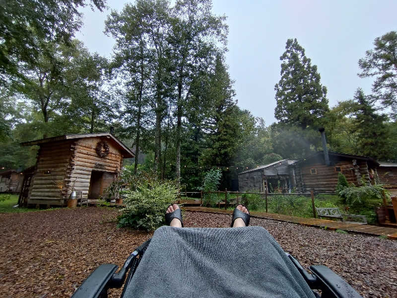 天然の水風呂を浴びたあとは、ポンチョをまとってインフィニティチェアに寝転ぶ。目の前には緑の林と眩しすぎない曇天。ポンチョが小雨を防いでくれると同時に、急激な冷却から身体を守ってくれる。布団にくるまれているような安心感。