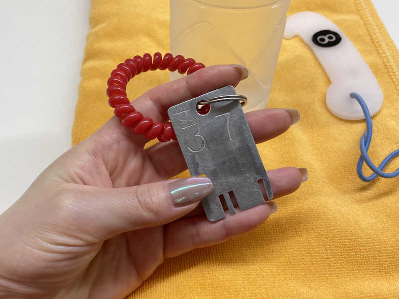 熱の庵に入る為の白いプラスチックで作られたサウナキーで木製の扉を引き開ける。