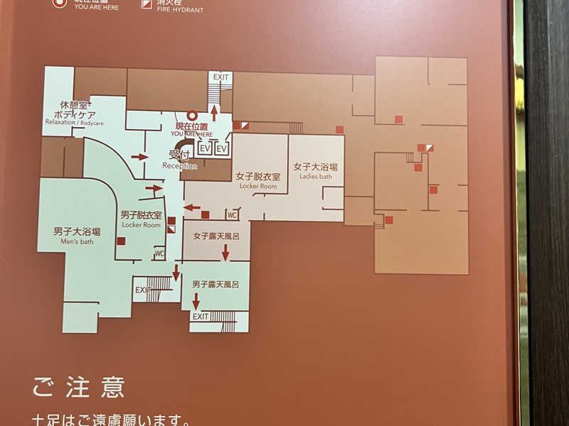 内湯(天然モール温泉)・サウナ・あかすり・ボディケアのエリアと、露天風呂のエリアが別。
