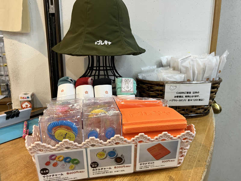 #プレキャ オリジナルのサウナハット、モクタオル、キーホルダーなどが売っている。