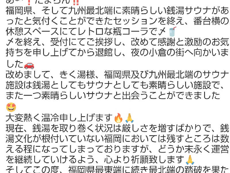 水風呂は体感20℃超でしょうか。少し攪拌しながら長く浸かって冷えました。水風呂に入りながら息を整えて、また熱気浴室に向かってセットを重ねました。途中でサ友のゆーきさんが来られて偶然偶然、ゆーきさんも北九州の銭湯サウナをよく回られています。とうとう銭湯で偶然できました。ゆーきさんと入れ違いで上がりました。