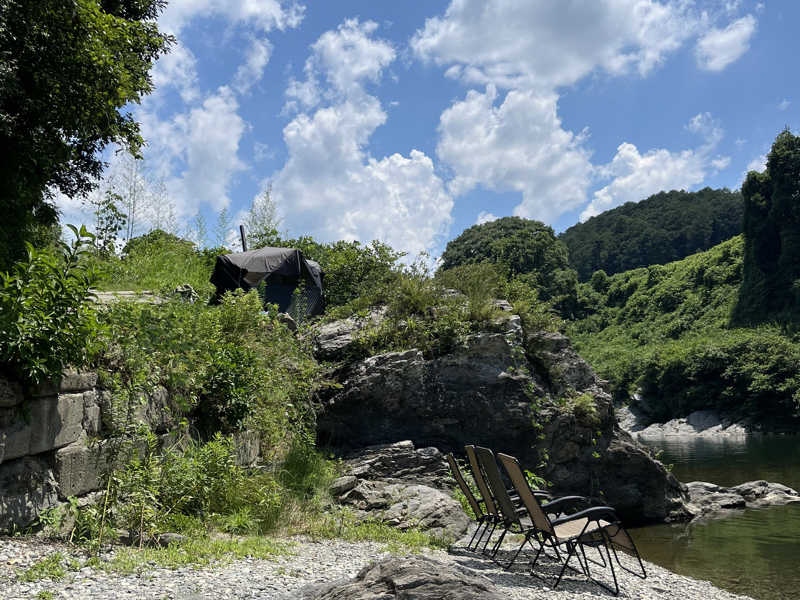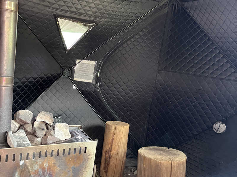 テントサウナは110度になっており、最初からアチアチで最高。川も目の前だが少し岩の坂を降りて、ライフジャケットを着て入るようにとのこと。