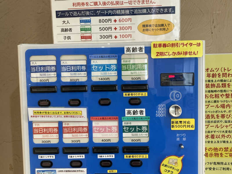 | 駐車場 | 最初の2時間1時間につき200円(大型の車両600円) プール・大浴場利用者は、1時間につき100円(大型の車両300円) 2時間超えた時間 30分につき100円(※大型の車両300円) |