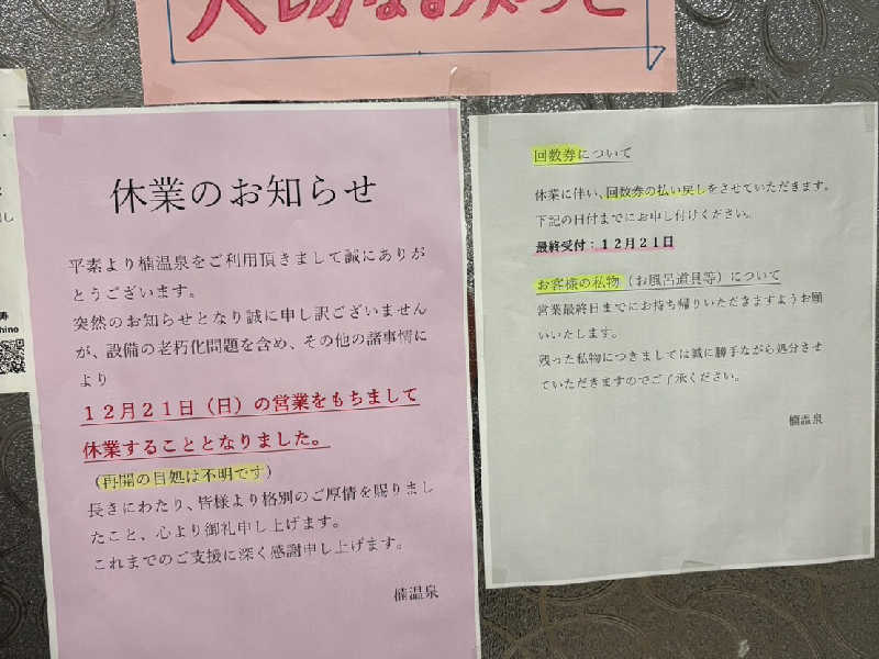 職場の先輩から「楠温泉が閉まる」と聞き、まさかと思って駆けつけた。