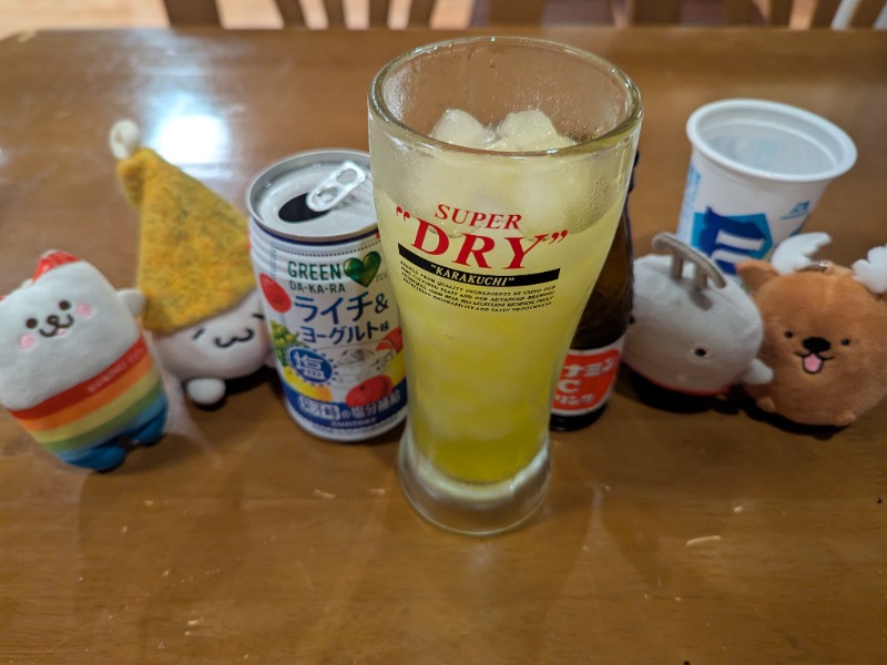 オロックスをジョッキで飲もうとしたらちょい足りないので自販機でライチ&ヨーグルトを追加