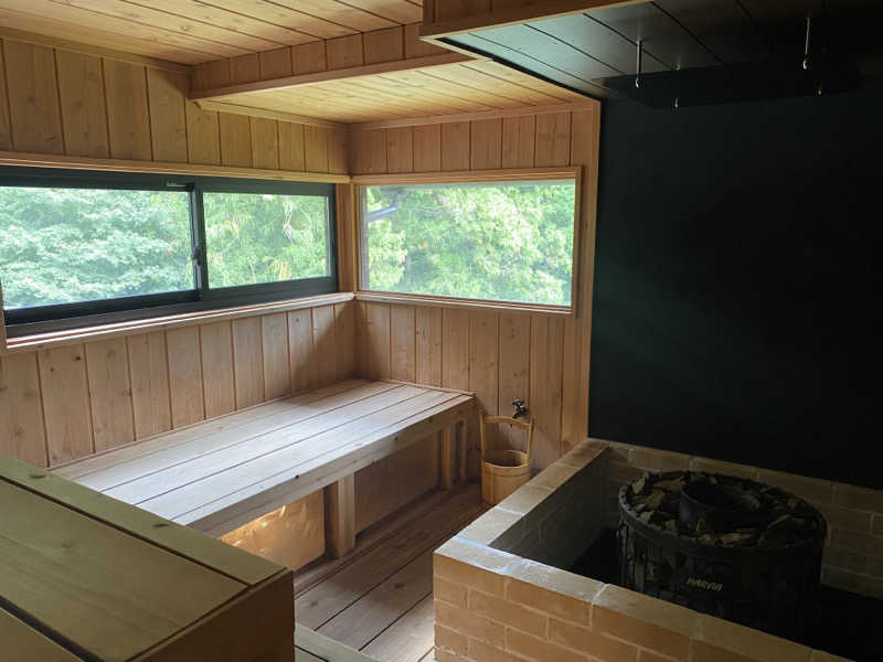 サウナ室に入るとすでに野草の香りに満たされおり 開けることが可能な窓がある 山ノサウナに相応しい景色が拡がっている 窓を開けると山のフレッシュエアーを吸うことができる 窓を開けることで更にゆっくりサウナを楽しむことができる サッシの窓を開けることができるという発想が面白い😆 2段目に座るとなかなかの熱さです ストーブのストーンに鍋が置かれておよ りロウリュ用に野草が煮込ませいる そこに自分で摘んだミントの葉っぱを入れて煮込む その煮汁をロウリュする これはいい👍️ この体験ができるのはサウナ施設は無いだろう😆 私はフレッシュエアーとミントのロウリュを浴びれるストーブ前の下段が気に入った 外気浴はマイナスイオンたっぷりのフレッシュエアーと川のせせらぎの音を聞きながら休憩することができた 来て良かった😆