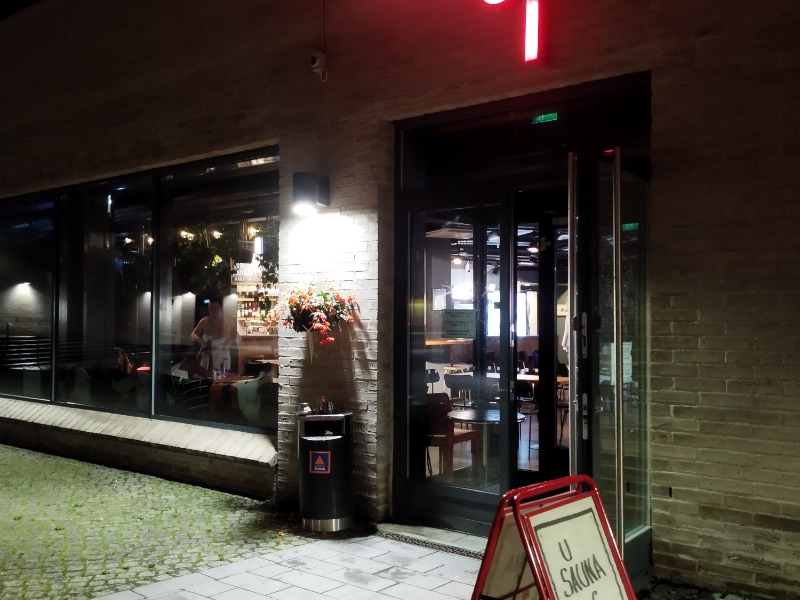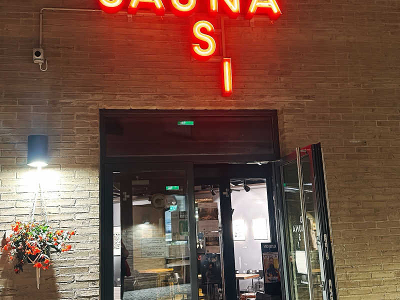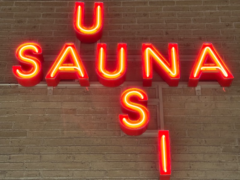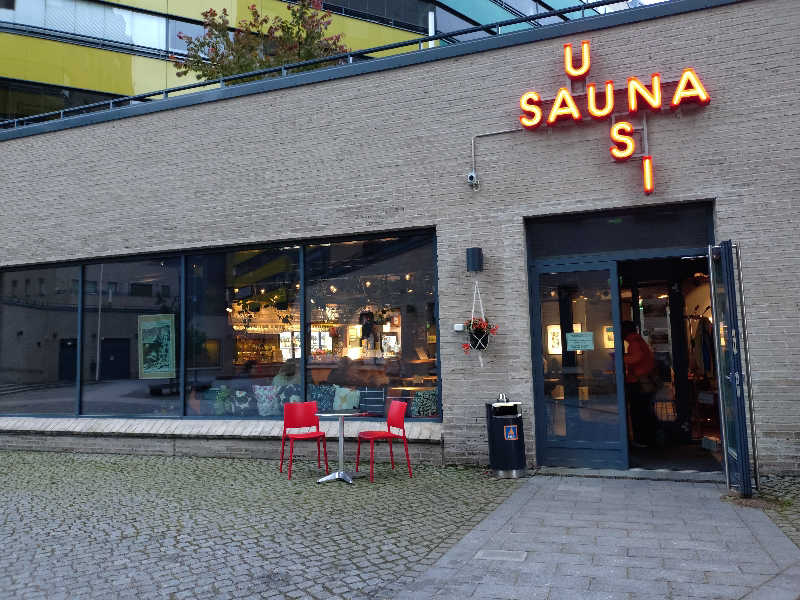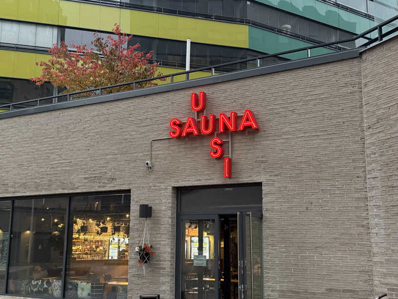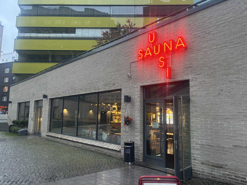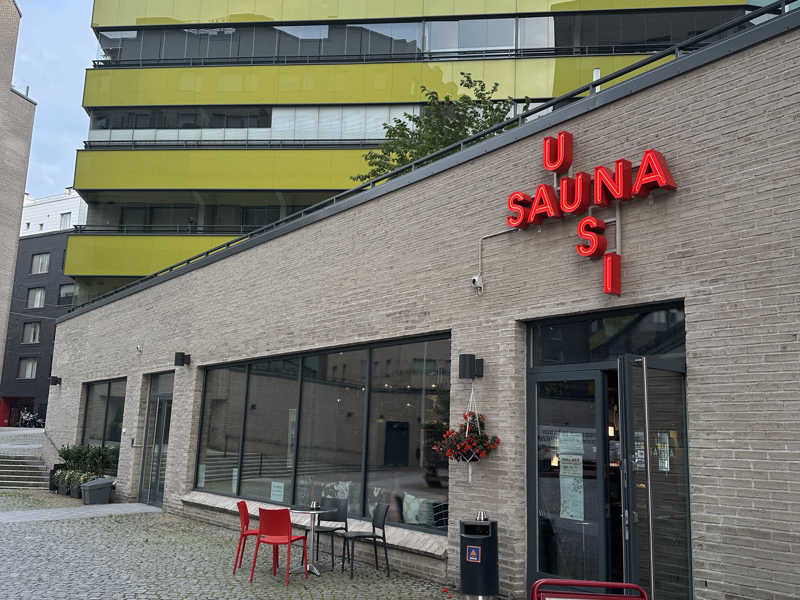 夕方中心部からトラムで郊外に移動し、マンションが並ぶ路地裏にオシャレな赤いネオンが灯る『UUSI SAUNA』が見えてテンションが上がる!