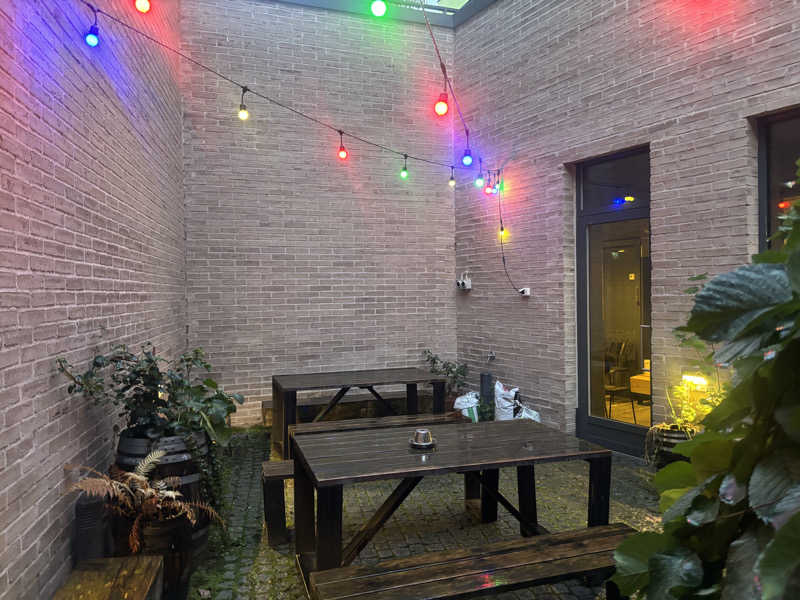 水風呂はシングルだったので諦めて、シャワー浴びて中庭へ!