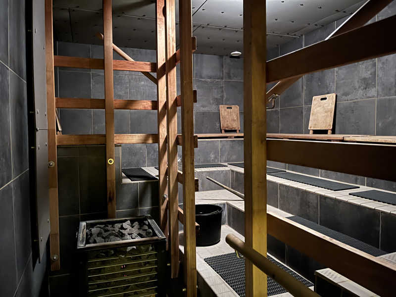 天井の照明1つだけとかなり暗め。入り口正面に大きなストーブ(というより釜)があり、めちゃめちゃ大きなラドルを使ってセルフロウリュできます