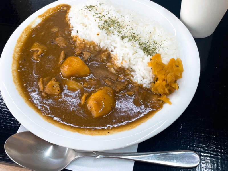 懐かしい系シンプルなルーに、ライスの青のりもいい具合に効いてる。 食後はデトックス水でスッキリ!