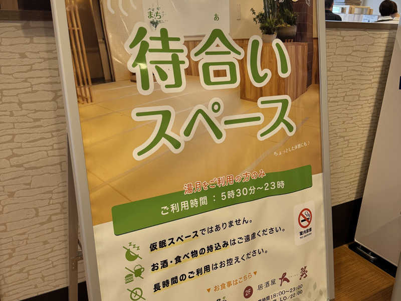 Mifune Terrace(ミフネテラス)は複合施設の名称で、その中に温浴施設「湯月」があります。靴箱無料、ロッカー無料。フロントに靴箱の鍵を預けると、バーコードのリストバンドがもらえます。それがお財布代わりになります。お会計はまとめて帰りに。