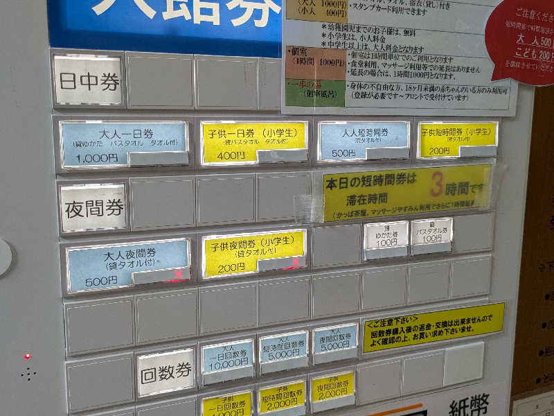 短時間券・タオル付き(土日祝:2時間 / 平日:3時間)500円 夜間券(午後5時より)500円 食堂と売店でキャッシュレス決済対応可 |