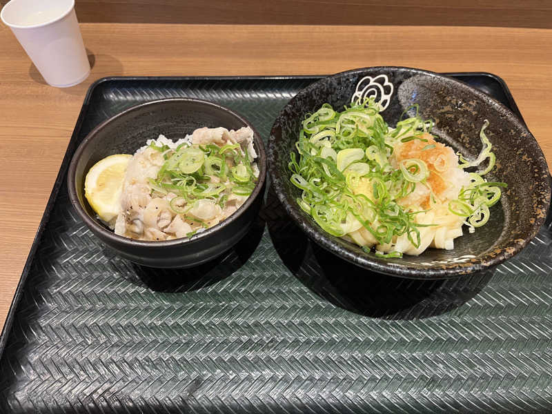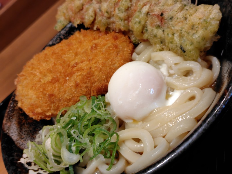 施設内はなまるうどん。かま玉食べたかったけど品切れ。ちくわ天とコロッケ追加。