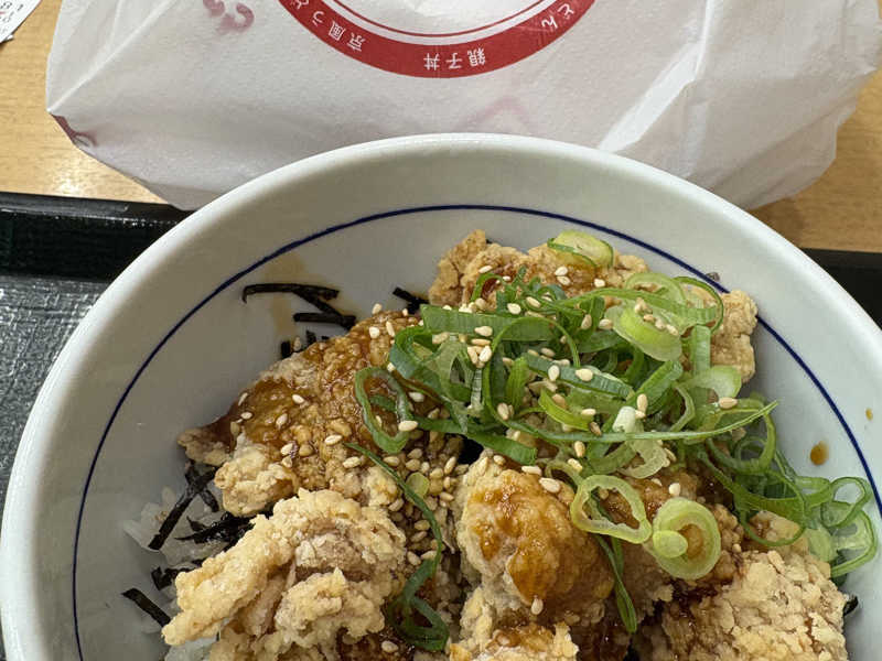 唐揚げがサックサクで予想以上においしい‼️なか卯の冷たいお茶もおいしいんだよなぁ🤤