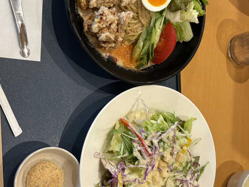 炒りごまのタレと麺が絡んで、野菜も冷たくて美味しい♡唐揚げはジューシーで味が付いていて、温かい♡
