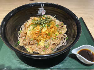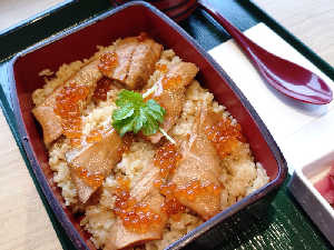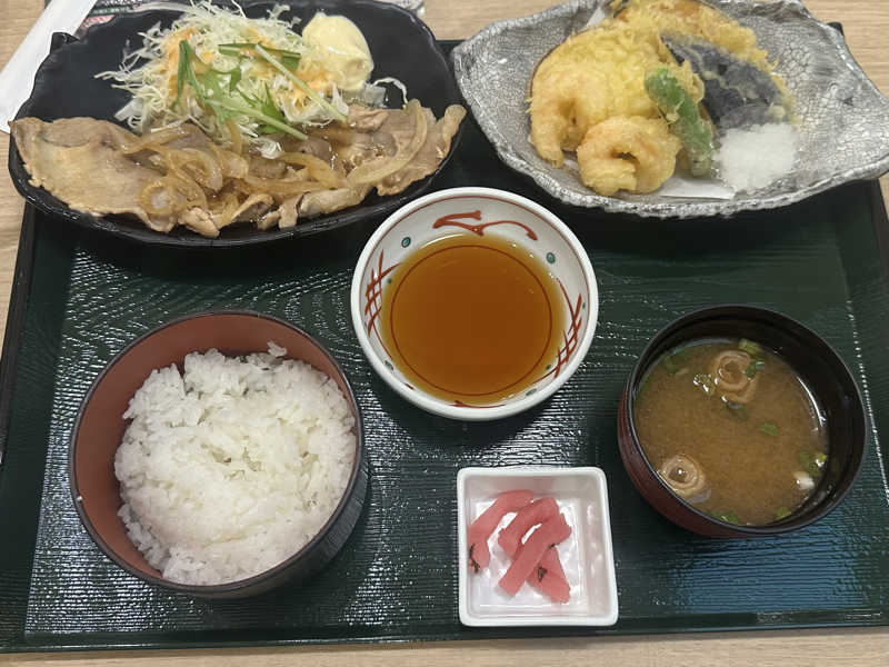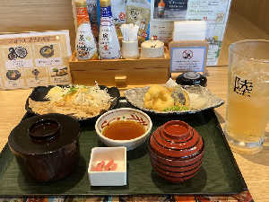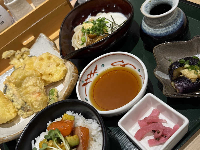 サーモンアボカド丼・トロロナメコうどん・茄子揚げ浸し・天ぷらのお得なセットです。ドリンクバーと共に。