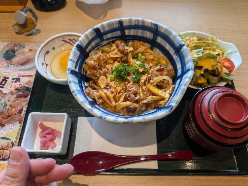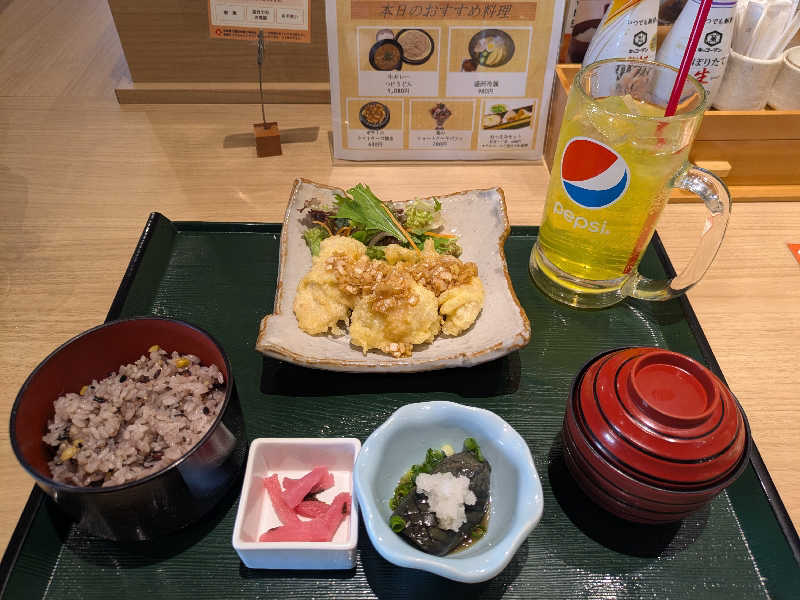 サーモンアボカド丼・トロロナメコうどん・茄子揚げ浸し・天ぷらのお得なセットです。ドリンクバーと共に。
