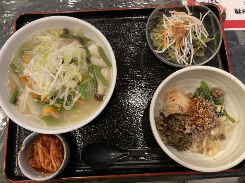 うどん野菜たっぷりで海鮮も入って何よりスープ美味しい😋これにビビンバとサラダと美味しいキムチ。最高😆
