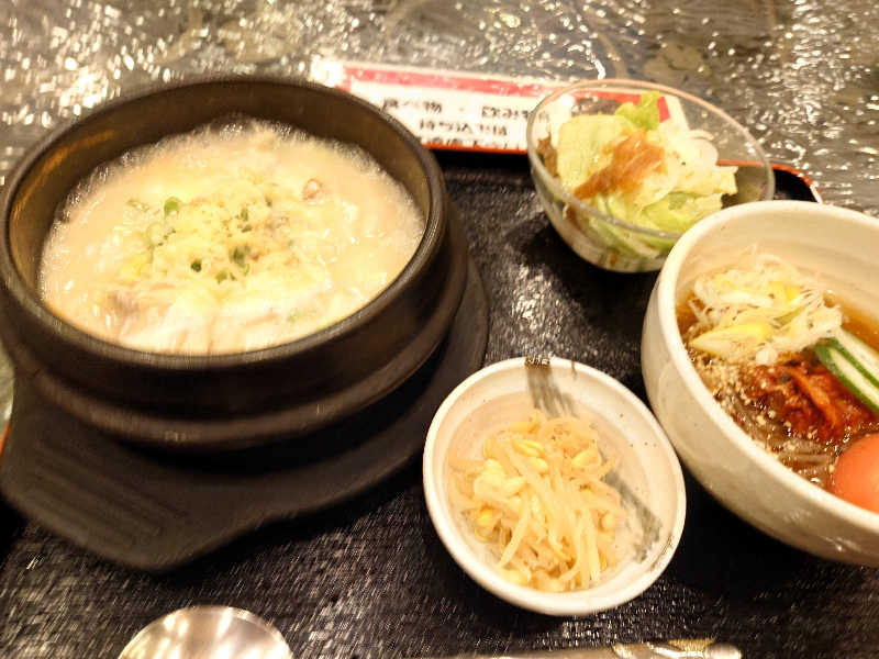 鶏肉チーズ塩クッパ・ハーフ冷麺・サラダ・ナムル 平日18時〜の提供で1300円は破格。