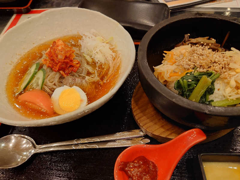 韓国風冷麺と塩チゲセット。熱いと冷たいで…丁度いい🤣