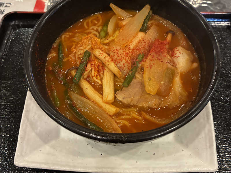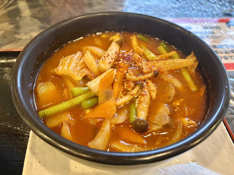 なめてた辛さ🥵辛党満足👍きのこや野菜が多めで、麺は細めちゅるちゅる。