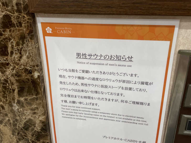 札幌サウナ旅3日目。最終日にしてしっかりベッドで睡眠を取るため、サウナが売りとなっているプレミアホテル-CABIN-札幌さんへ。予定より少し早めにチェックインできたので早速キめていくか!と思いきや、まさかのストーブが水責めにより故障中。こらあかんわ、サ飯は函館で買ったイカ飯、サ〆はカスtoveで萎えたgo 家へ〜♪とサ室の扉を開けると、まさかのアツアツ完成品のドライサウナが登場。全4段あり、最上段は天井に頭がつきそうなほど高くなっていた。サ室自体が非常にコンパクトなので室温が上がりやすく、表示温度は80℃と一般的な温度ではあるがしっかり熱を浴びることができた。