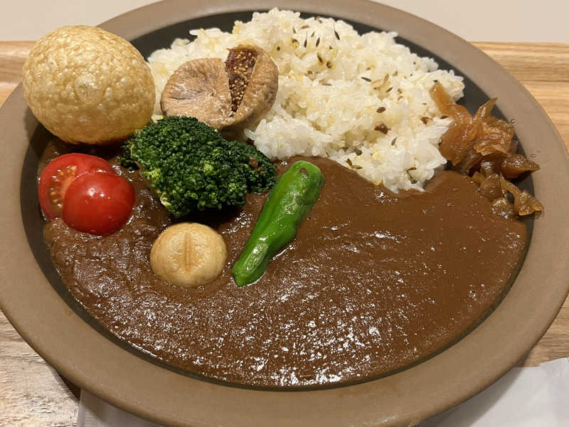 フルーティーで美味しすぎるカレー。謎のボールの正体は未だ分からず。 シナモンほうじ茶と共に。