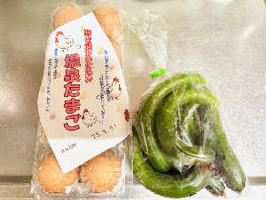 受付近くへ産直あり。美味しそうな温泉卵2パックと、一袋100円のきゅうりを2袋購入。
