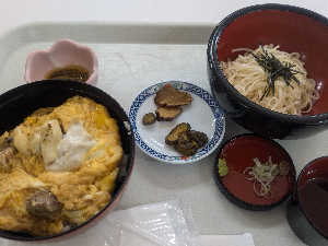 親子丼(比内地鶏?)、稲庭うどん、いぶりがっこ、じゅんさいのラインナップ。注文〜着が速い🏇