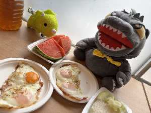 庄内地鶏のベーコンエッグとメロン漬物、西瓜など秋田県産食材をモリモリ食べたら元気100倍怪獣がお。