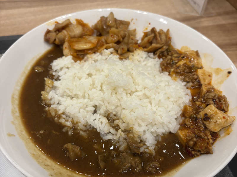 牛すじカレー。麻婆豆腐。豚キムチと色々乗っています。 まさかの全てが美味しかったです。