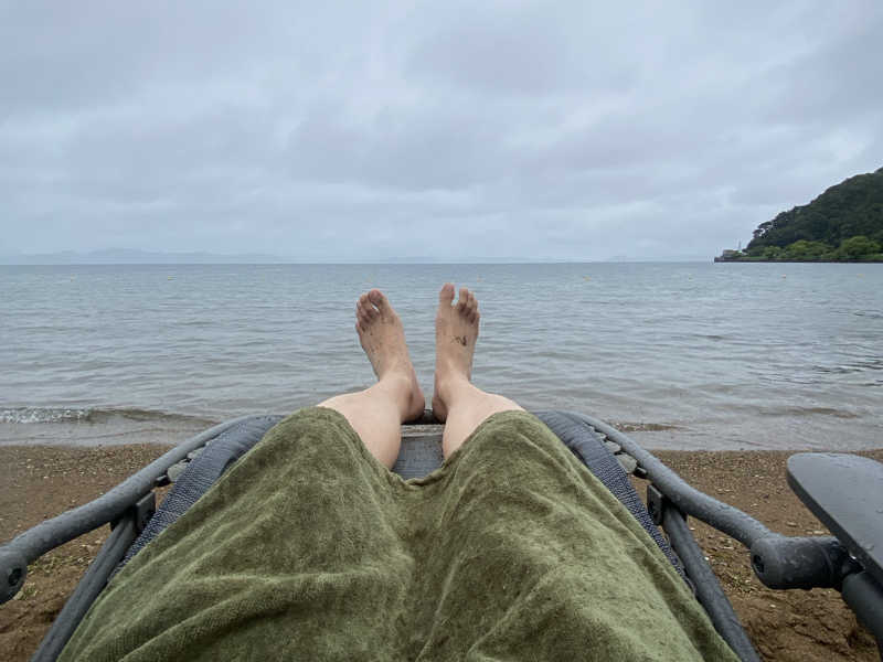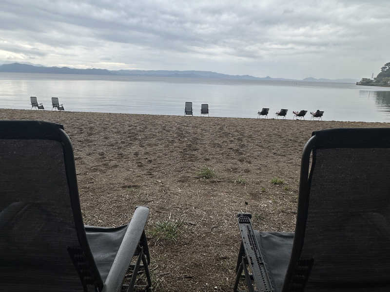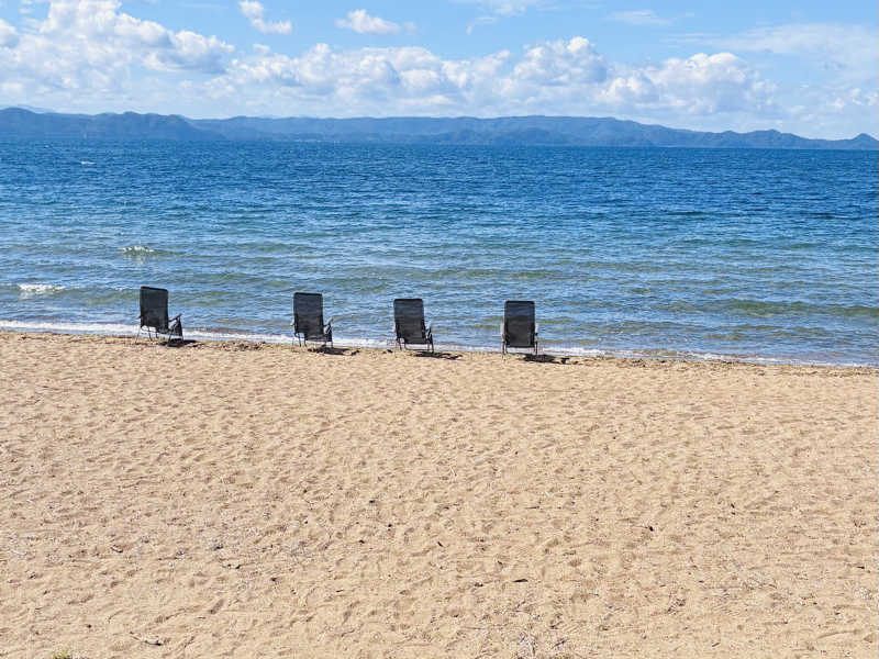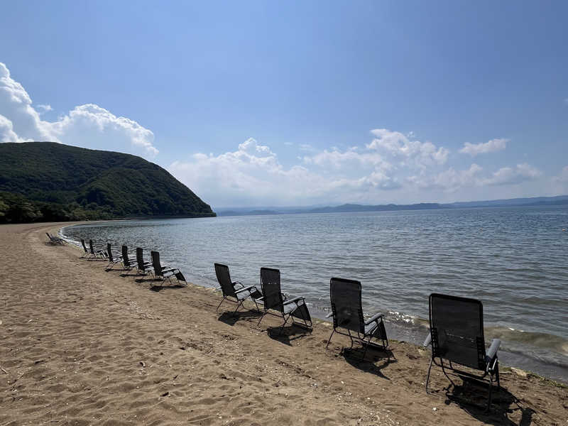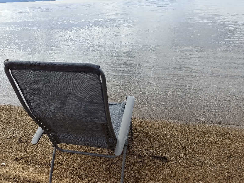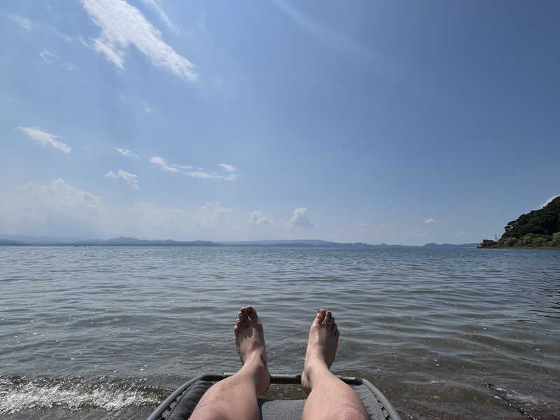 水風呂は猪苗代湖で本日の水温は27度でした。水辺から20メートルのところに浮があり、そこまで行くことができます。奥に行けば行くほど冷たくなります。夏のため少し緩いですが、水が綺麗で魚が泳いでいたりと、普段の水風呂では体験できない開放感があります。インフィニティチェアを事前に人数分用意してくれており、猪苗代湖の水辺ギリギリの場所で整うことができます。
