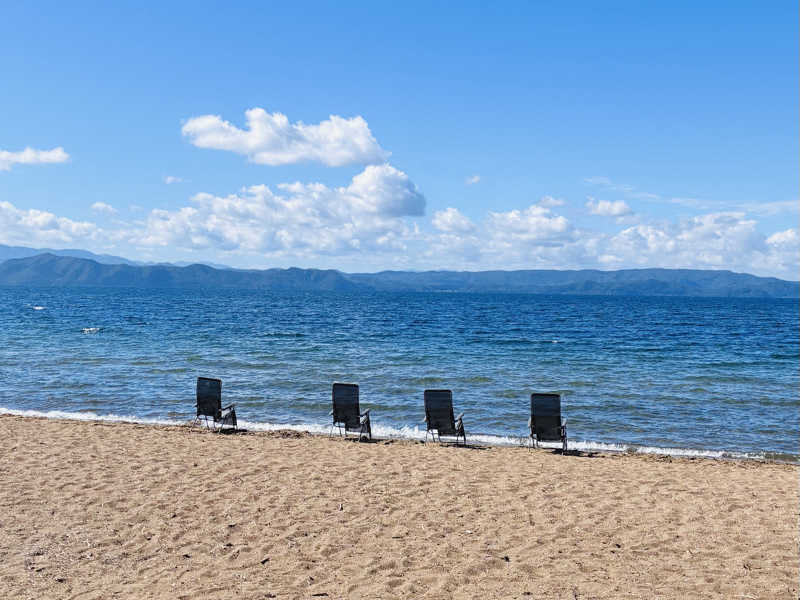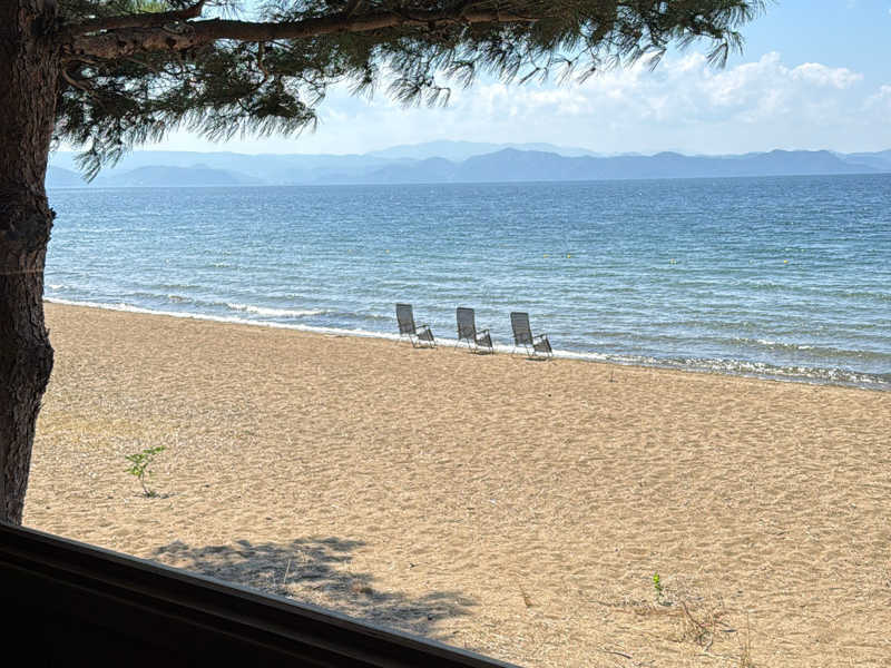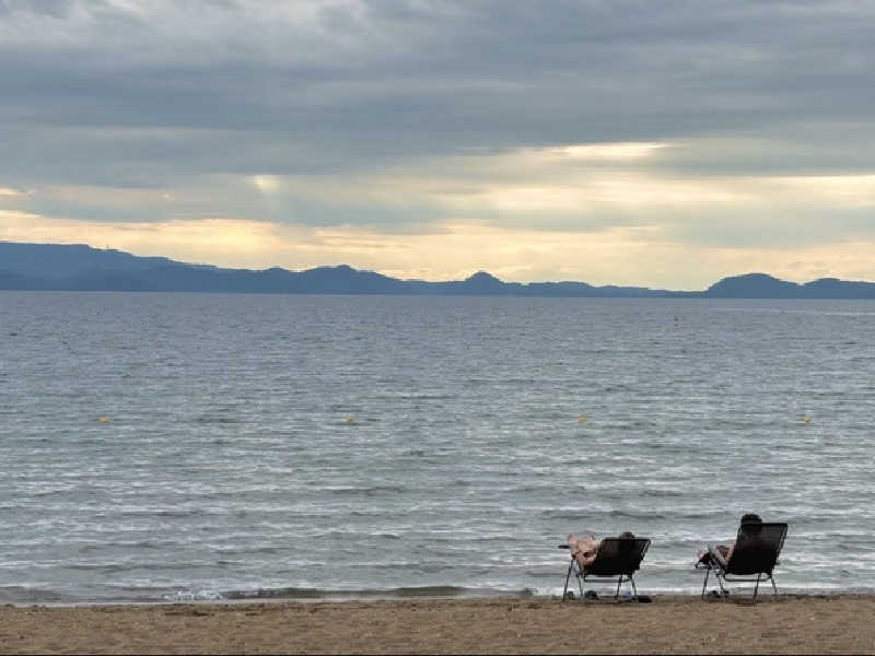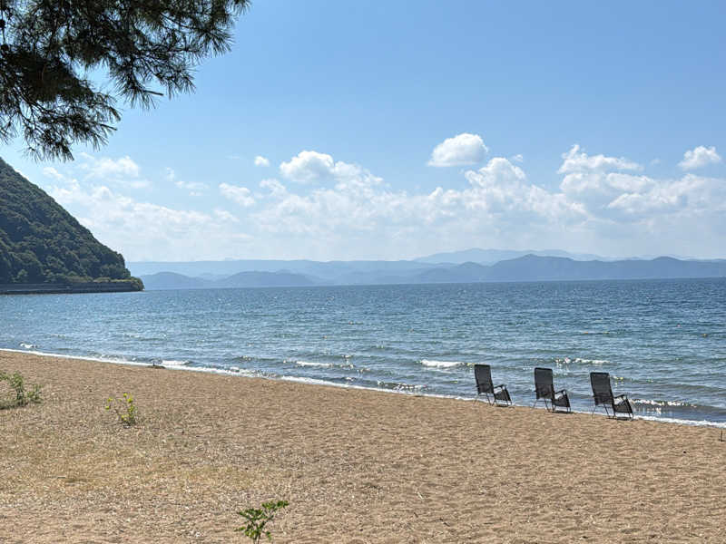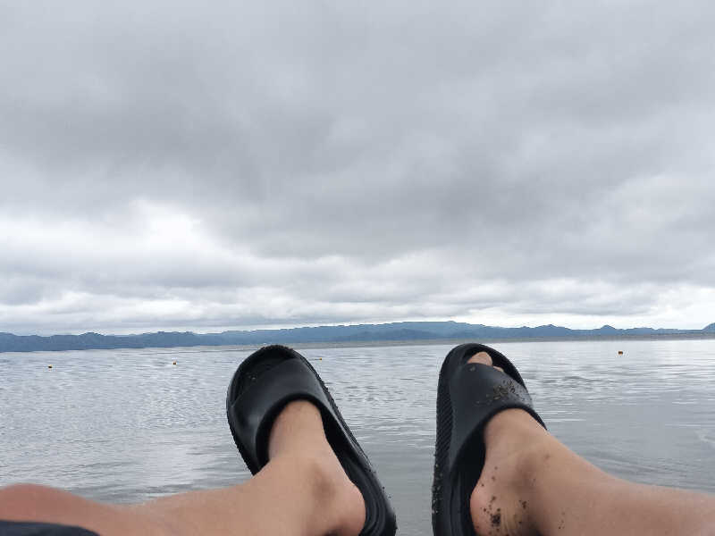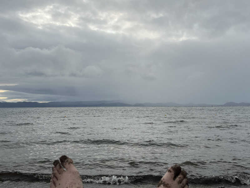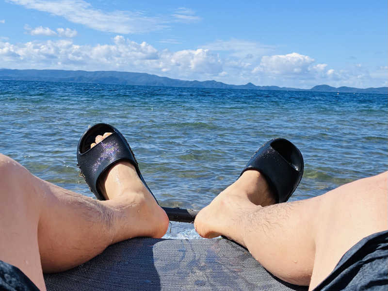 水風呂は猪苗代湖で本日の水温は27度でした。水辺から20メートルのところに浮があり、そこまで行くことができます。奥に行けば行くほど冷たくなります。夏のため少し緩いですが、水が綺麗で魚が泳いでいたりと、普段の水風呂では体験できない開放感があります。インフィニティチェアを事前に人数分用意してくれており、猪苗代湖の水辺ギリギリの場所で整うことができます。