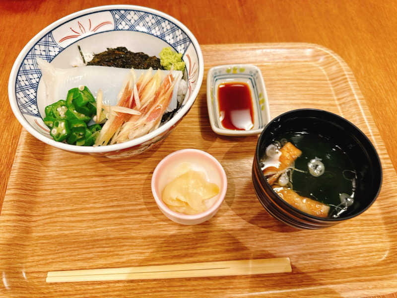 いか刺しに「ながも」という佐渡島特産の粘りのある海藻が入った丼。オクラとミョウガが良いアクセント❗️