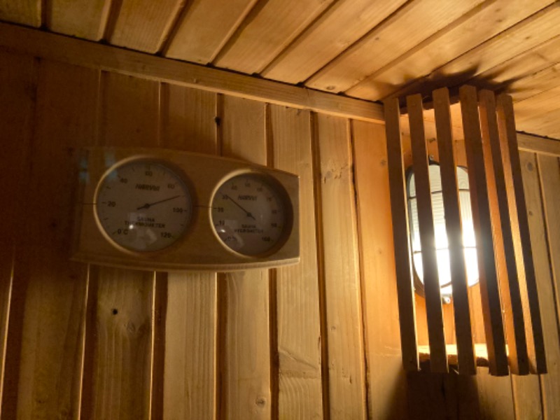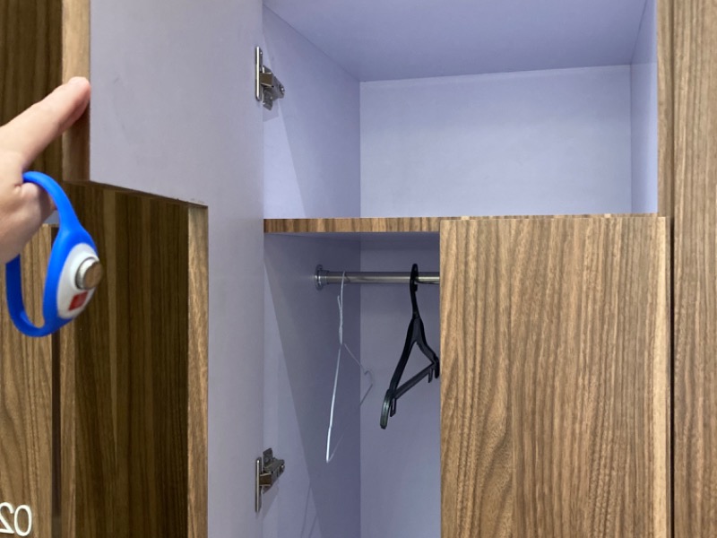 ホテル10階のジムの脱衣所内にサウナ室があり、水着着用で利用可能。脱衣所内にオーバーヘッドシャワーが2台。