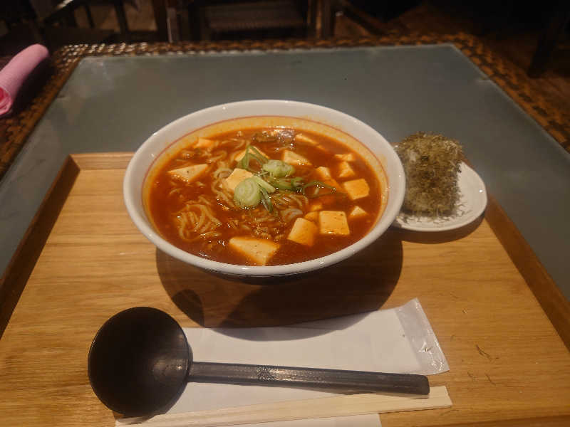 サウナ後でも熱く辛いので、汗が出ますが美味いラーメンです。 おにぎりセットで嬉しいです。