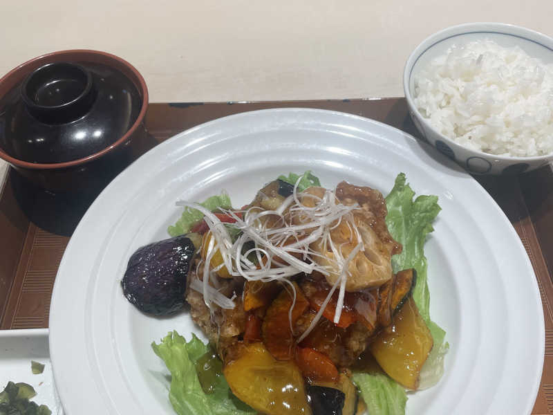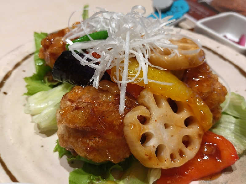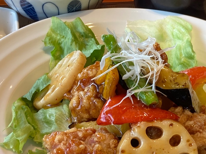 茄子、パプリカ、ししとう等いろどり鮮やかな野菜の素揚げと唐揚げ。ご飯大盛りにしとけば良かった。