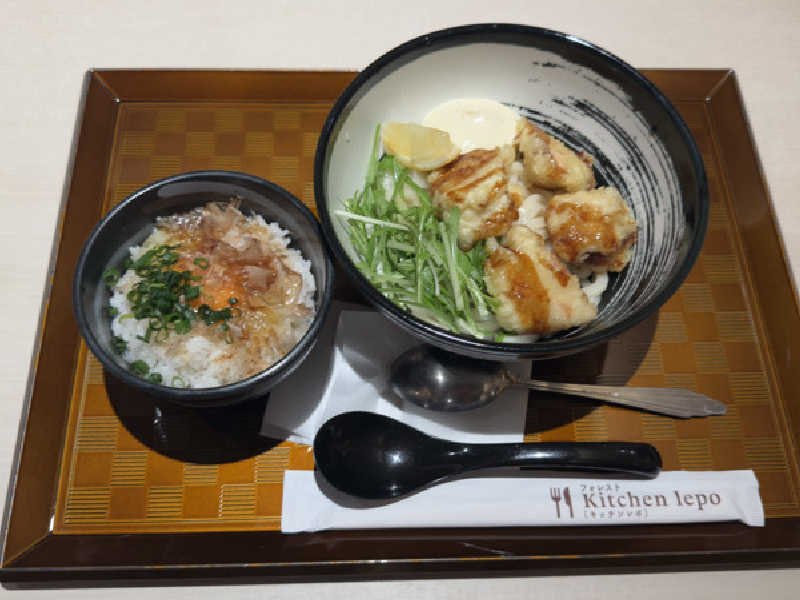 大きくて美味い鶏天がゴロゴロのってる( ´▽`)コシのあるうどんも良い。レンゲの出番がなかった。