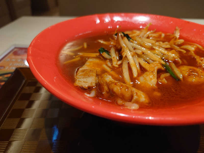 新メニュー!ピリ辛スープにモツの旨みが溶け、美味い😋もつマシにしましたが思ったより少ないかも。