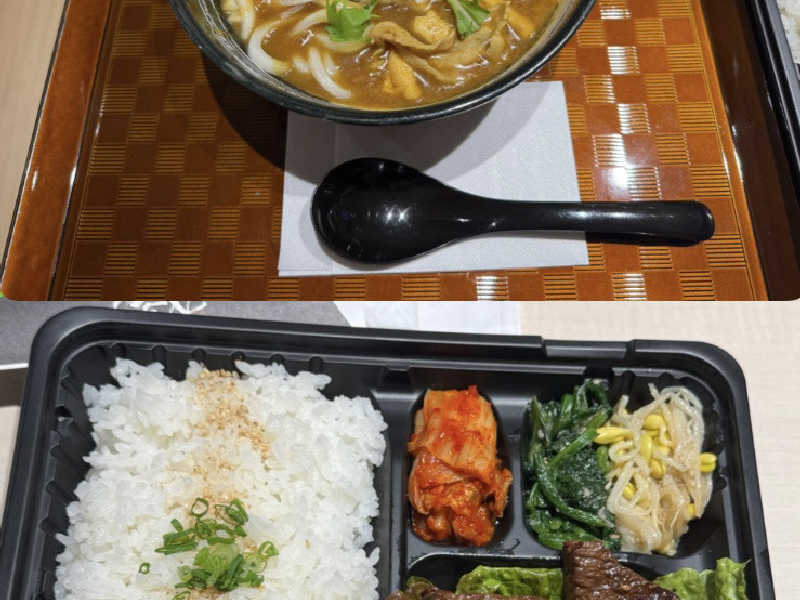 カレーうどんはサウナ後に適した味で満足👅 焼肉弁当は牛肉が柔らかくてジューシー🥩最高😀