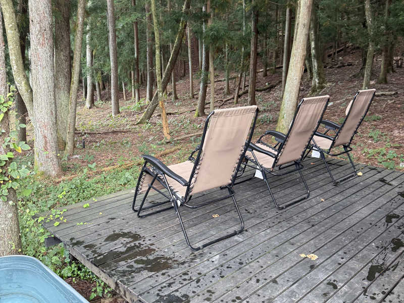 外気浴もしっかりコールマンのインフィニティチェアが3脚あり、視界に抜ける森林でめちゃくちゃととのう!!