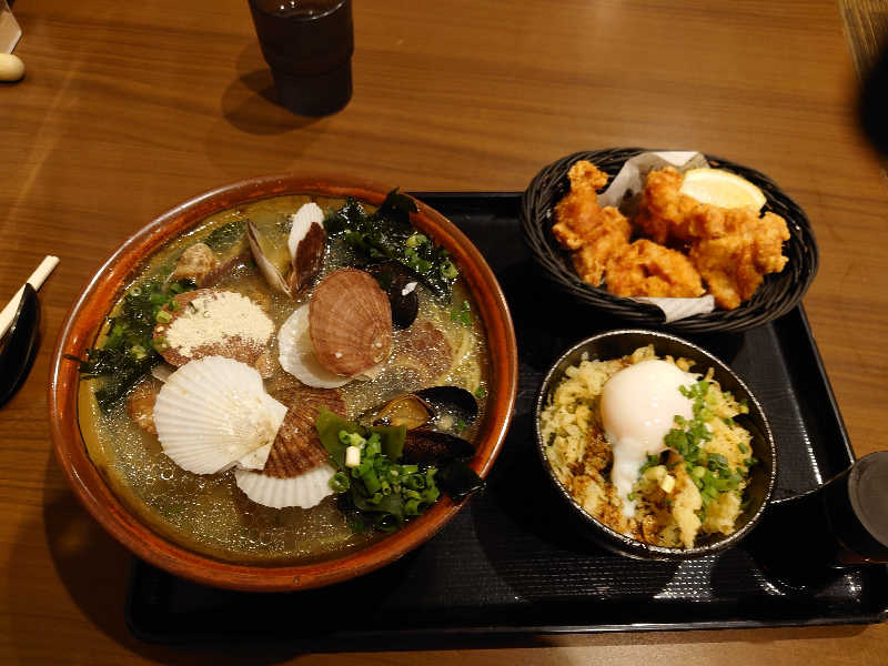 サ飯に火山拉麺!辛味のきいたスープに野菜たっぷりで旨し🍜ミニカレーと黒烏龍茶も相性抜群👌