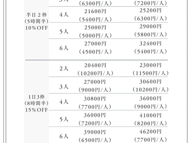 2人8000円(4,000円/人) 3人10500円(3,500円/人) 4人12000円(3,000円/人) 5人14000円(2,800円/人) 6人15000円(2,500円/人) 土日祝 2人9000円(4,500円/人) 3人12000円(4,000円/人) 4人14000円(3,500円/人) 5人16000円(3,200円/人) 6人18000円(3,000円/人) 半日2枠(5時間半)10%OFF 1日3枠(8時間半)15%OFF 宿泊プランあり |