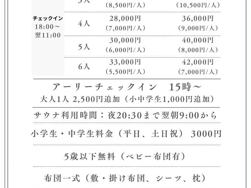 サウナ料金:2人の場合 平日8,000円、土日祝9,000円