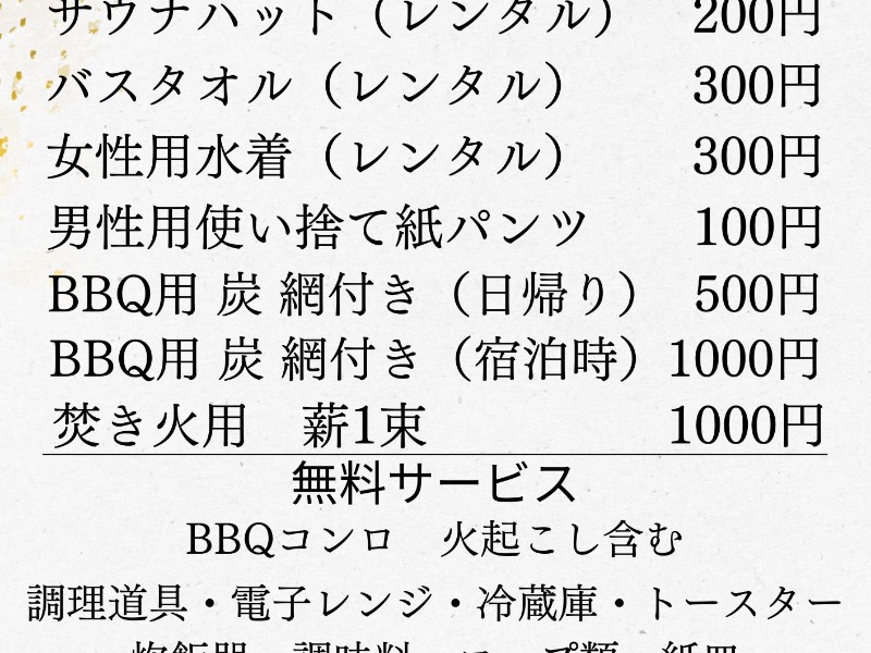 有料サービス:サウナポンチョ(レンタル)500円,サウナハット(レンタル)200円,バスタオル(レンタル)300円,女性用水着(レンタル)300円,男性用使い捨て紙パンツ100円,炭500円 無料サービス:BBQコンロ(網)火起こし含む,電子レンジ,炊飯器,トースター,冷蔵庫,サンダル,調味料,紙皿,フォーク,スプーン,箸,ハサミ,トング,アイスペール,コップ類,ドライヤー,アメニティー(化粧水,乳液,クレンジング,洗顔) 有料ドリンクサービス有 詳しくはホームページをご覧下さい