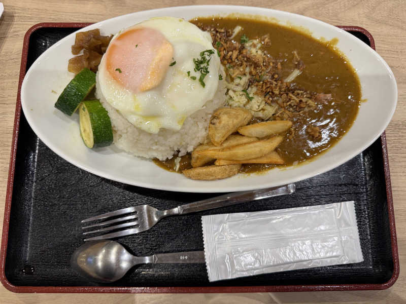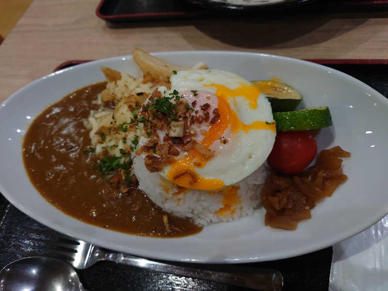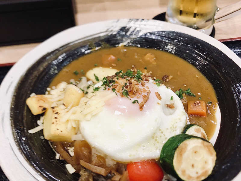 カレーに目玉焼きとポテトとチーズが追加で美味しい🥰 🍺は100円🤩
