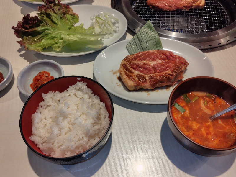 サービスのスープも美味。サウナの後の肉はうますぎた