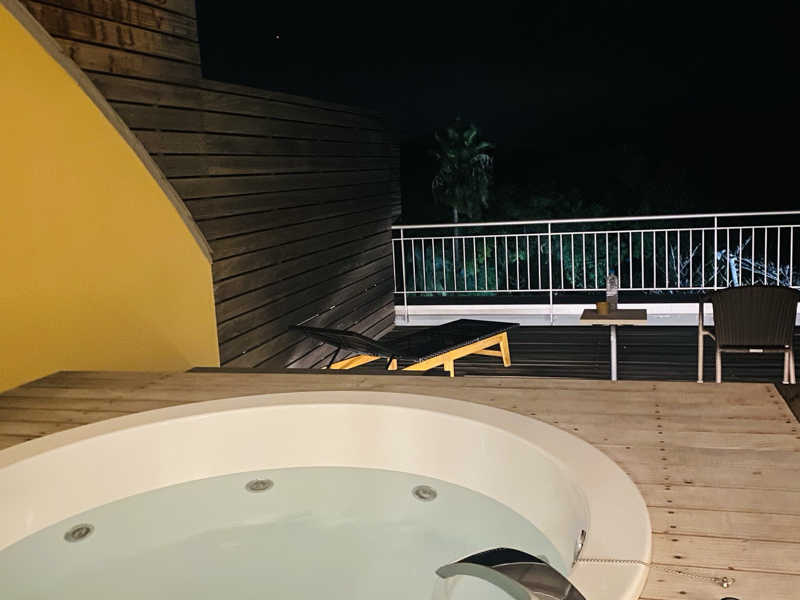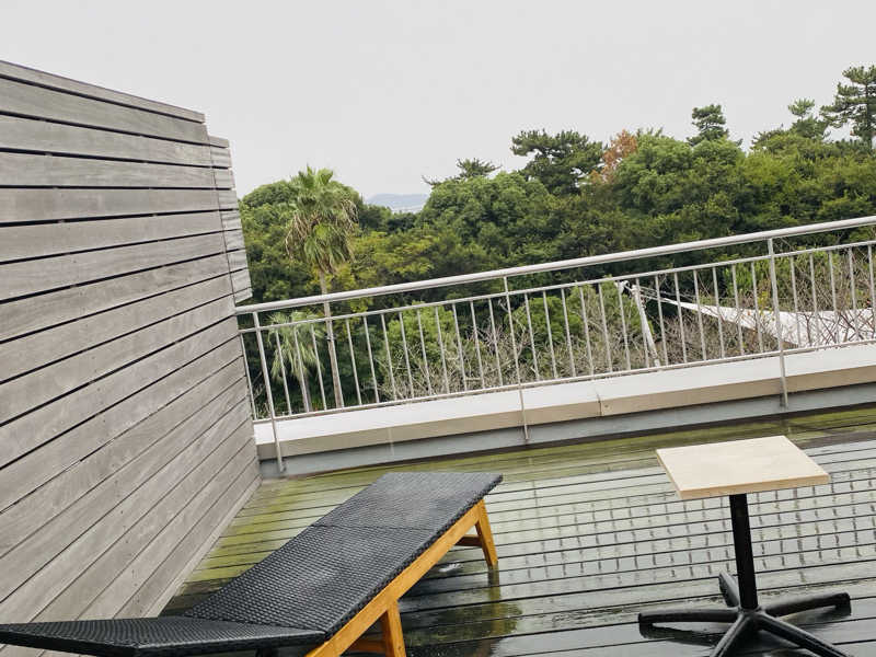 露天スペースにラタン風のデッキがあって快適にととのえるけれど、1台しかないのは残念