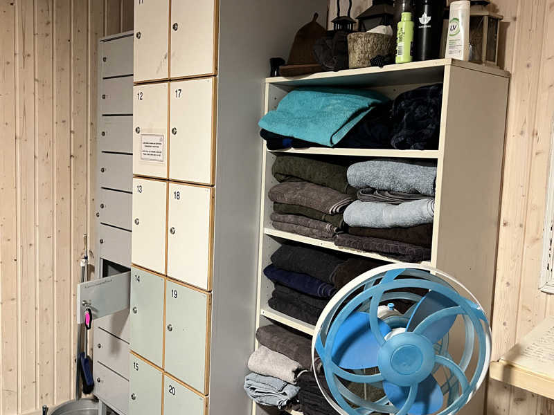 更衣室にはタオルやサウナマット、サンダルなどが置いてあった。更衣室外の脇にシャワーあり。