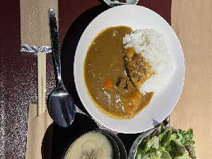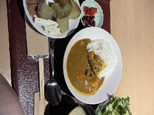 お肉が美味しい。じゃがバターのじゃがいもは厚真産。浅利のお味噌汁付き